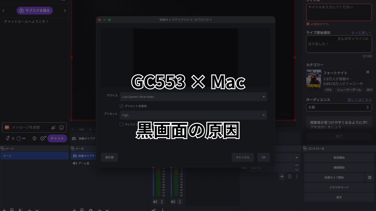 MacにGC553 Ultraを接続してOBSが黒画面になる場合、原因は以下のいずれかです。